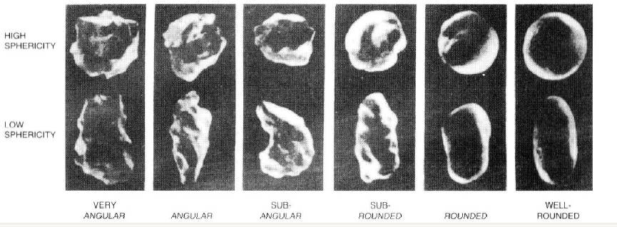 Look at the sample through a magnifier or microscope. Try to identify the average shape of the sand grains. The chart below will give you some ideas. Sand grain shape is based on two characteristics, its angularity, and how close it comes to being a sphere. Look at the chart below and try to match your average grains to one of the images. This is not an exact science, come as close as you can.